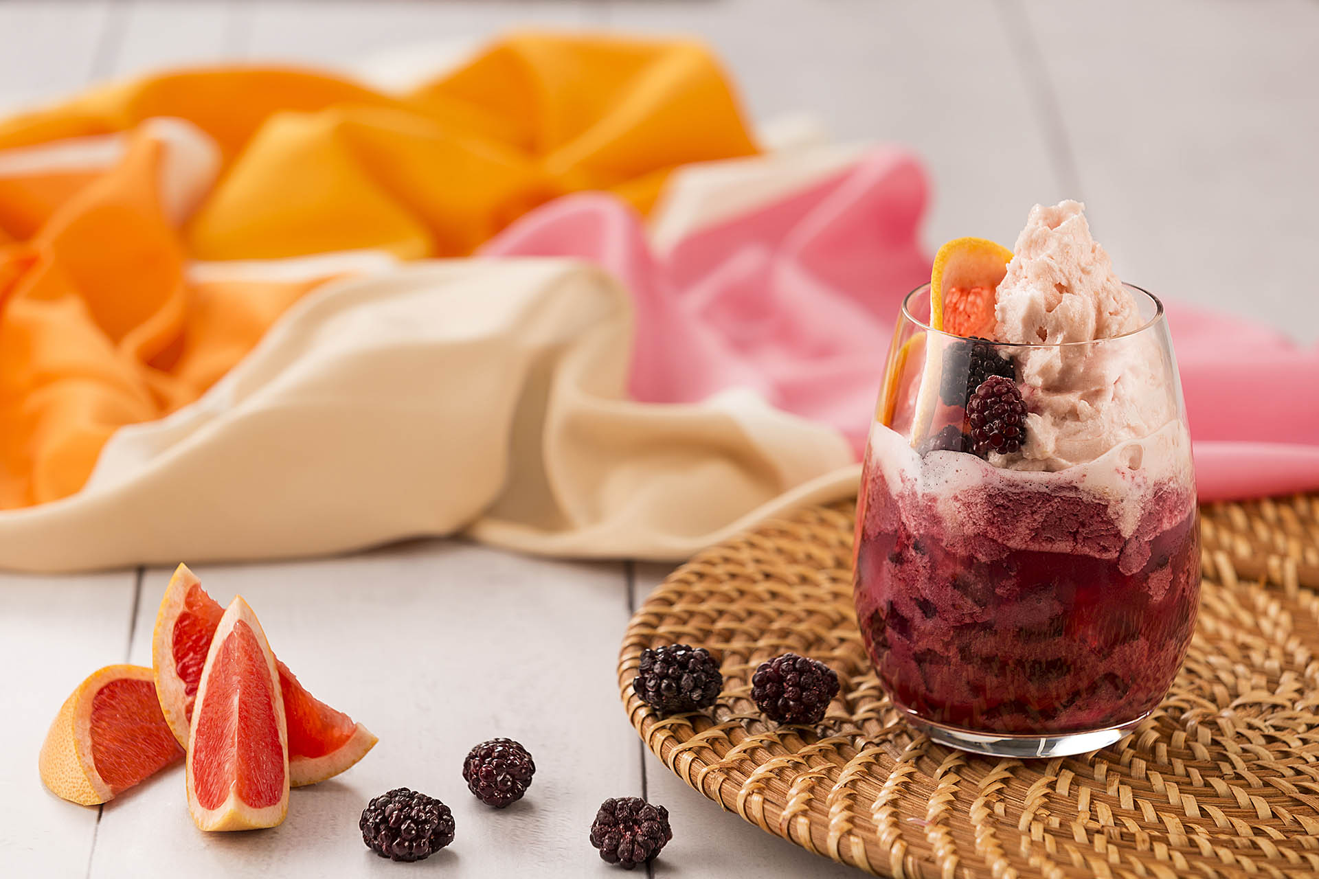 - Mezclar helado de moras y 25 gr de helado de pomelo con gin y tea.